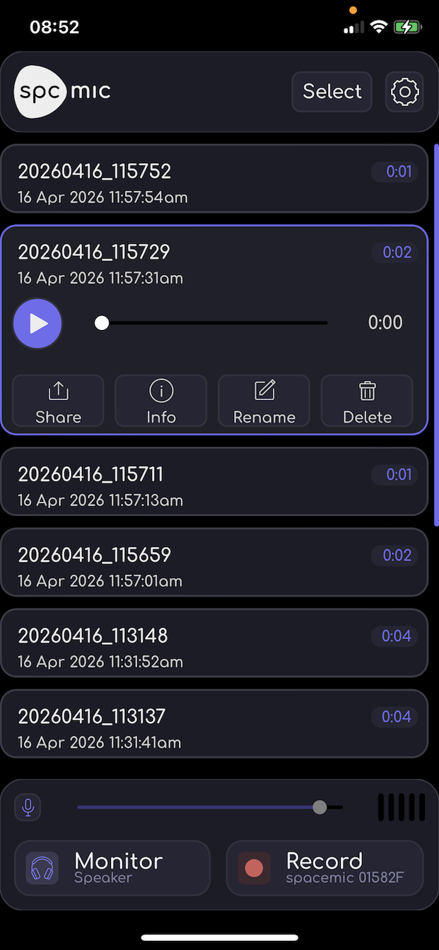 The spacemic has an extremely wide dynamic range, so the app includes a gain slider which enables you to produce files with a reasonable level that are easy to play back or include in mixes. However, all files are stored in 32 bit float format, which means that there is no adverse affect on sound quality from setting the level too low or to high. No clipping and no quantisation noise. If you discover that the level is too high or too low during a recording, you have the option of adjusting the recording gain in real time. However, it is usually better to just leave it and correct it in post. That way, the whole recording has the same gain.